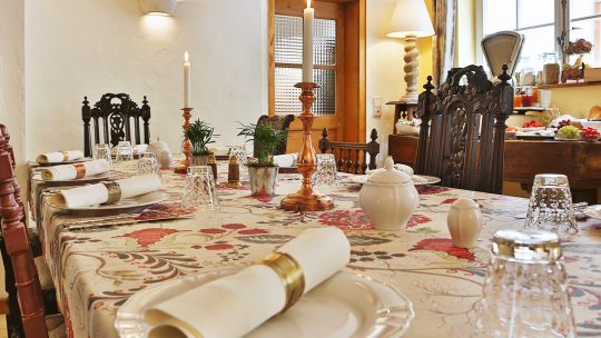 In unserem denkmalgeschützten Fachwerkhaus aus dem Jahr 1713 ist Unvollkommenheit ein Merkmal und doch charakteristisches Ambiente: Die Wände sind nicht immer gerade, die Türen und alten Dielenböden können manchmal etwas knarzen und die ein oder andere Tür etwas niedriger sein, als heute üblich. Antike französische Möbel, die originalen Holzbalken und detailverliebte Dekorationen fügen sich perfekt ins Bild und sorgen für einen ganz besonderen Charme.